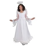 Includes long white dress with feather trim and halo headband. Read more